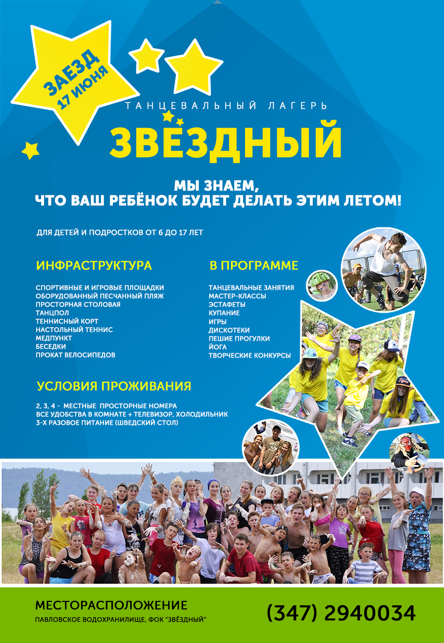 Мы не только дружно танцуем, но и отдыхаем все вместе! Вот такая добрая традиция уже много, много лет. В этом году заезд состоится 17 июня на 1 или 2 недели, запись уже открыта и ты можешь присоединиться к нашей веселой и творческой команде! Подробнее по телефону (347) 2940034.
