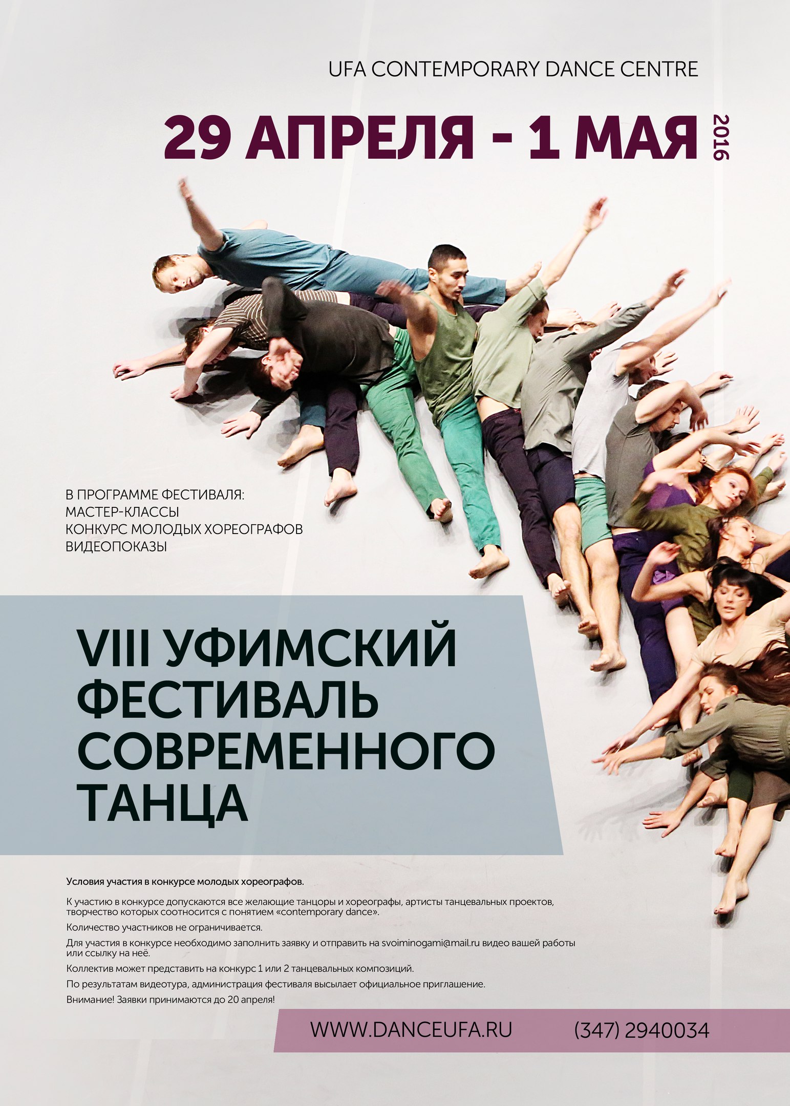 Мы рады сообщить вам, что 29 апреля - 1 мая этого года состоится VIII УФИМСКИЙ ФЕСТИВАЛЬ СОВРЕМЕННОГО ТАНЦА , который мы проводим уже восьмой раз!